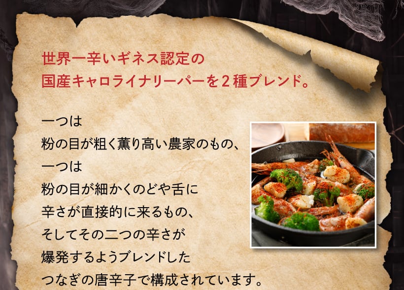 世界一辛いギネス認定の国産キャロライナリーパー、ドラゴンズブレスなどを含む唐辛子を独自ブレンドした超絶辛い唐辛子。
